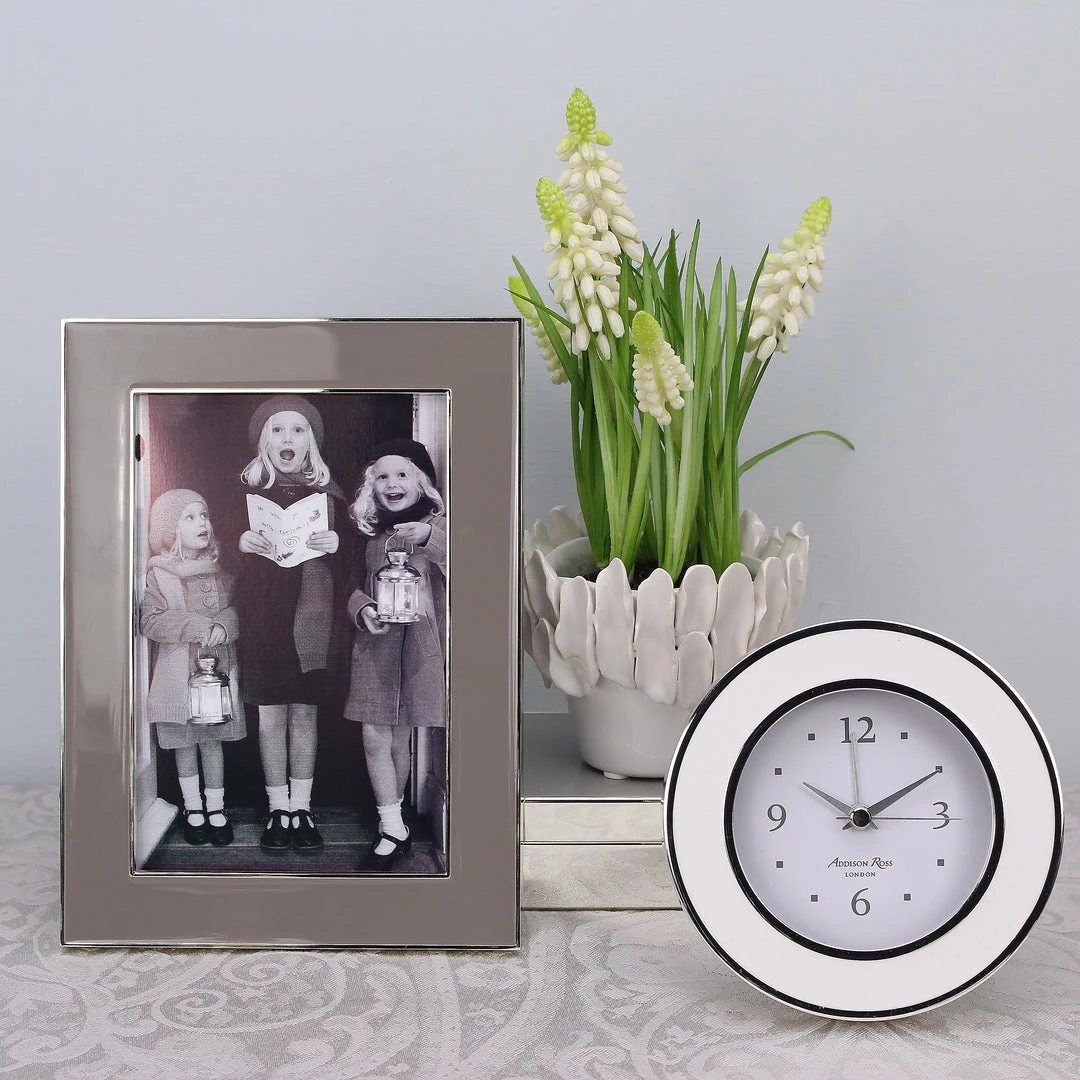 Our white enamel alarm clock beautifully compliments our enamel frames, complete with an alarm function, this clock is ideal for a bedside table or desk.