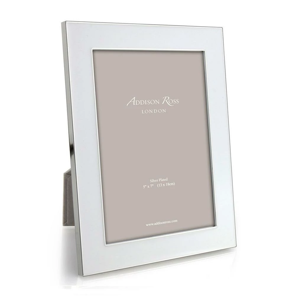 This white wide enamel and silver frame sets off both color and black and white photos beautifully. Will go with any color scheme. Group a collection of white frames together to create a beautifully tasteful display.