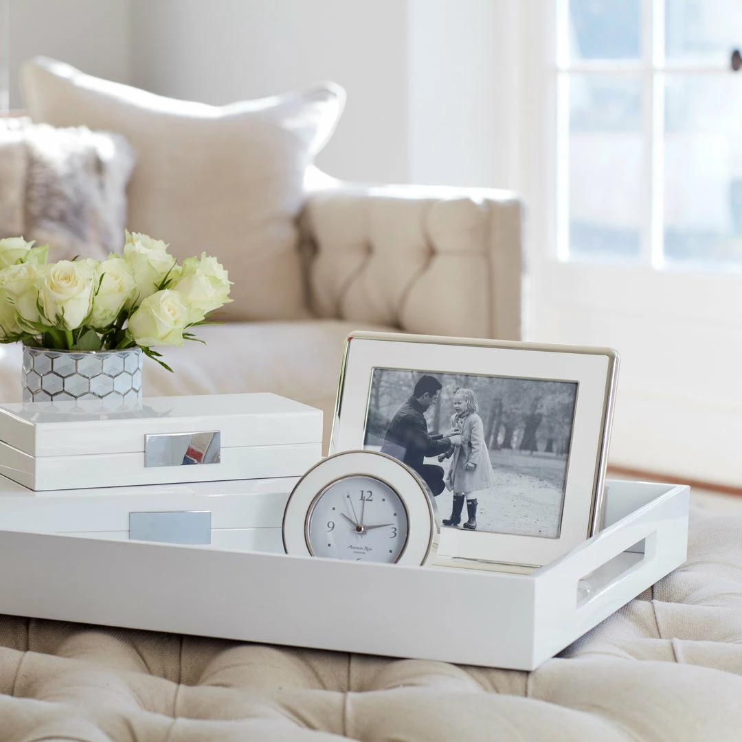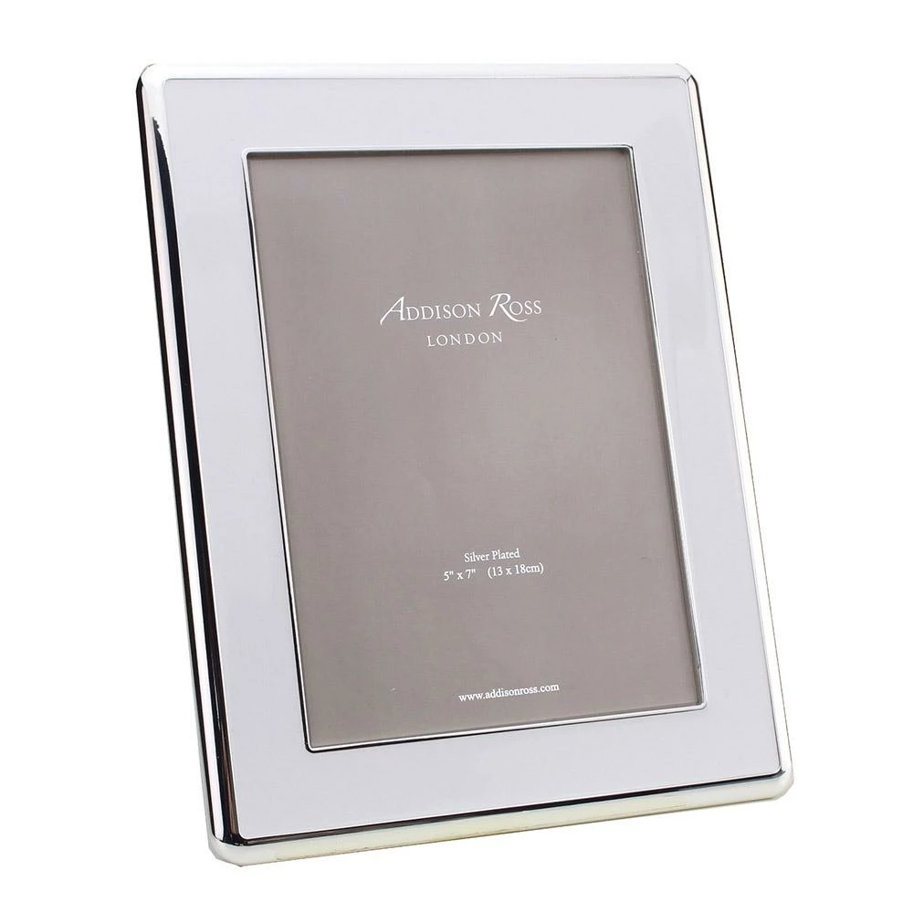 This exclusive and elegant approximately 1″ wide enamel frame in white enamel features a soft curved silver edge with a dove grey velvet back stand that has elegant round silver turn buttons. This frame suits all interiors, simple and elegant a perfect gift for any occasion.