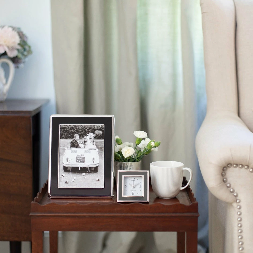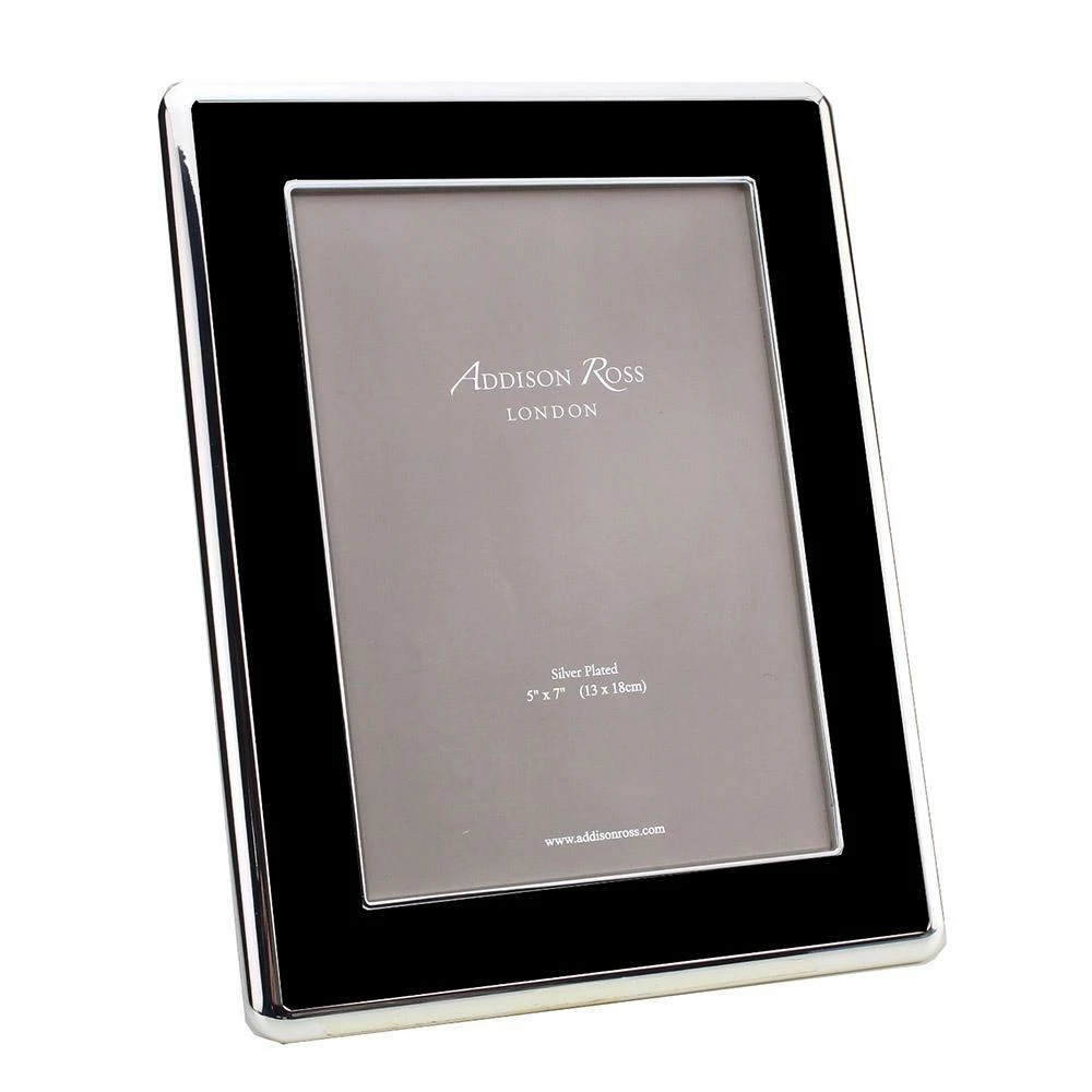 This exclusive and elegant approximately 1″ wide enamel frame in black enamel features a soft curved silver edge with a dove grey velvet back stand that has elegant round silver turn buttons. This frame suits all interiors, simple and elegant a perfect gift for any occasion.