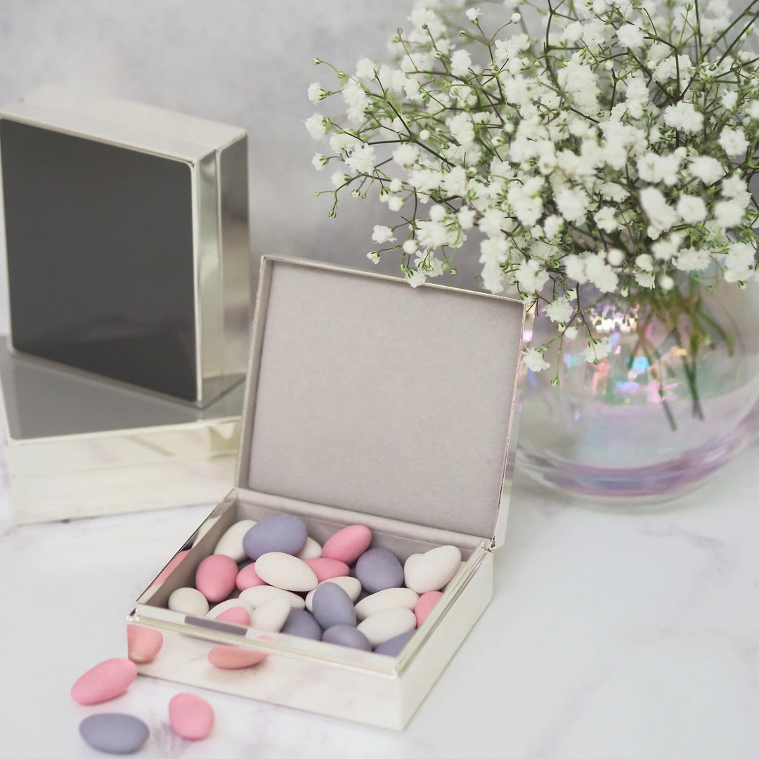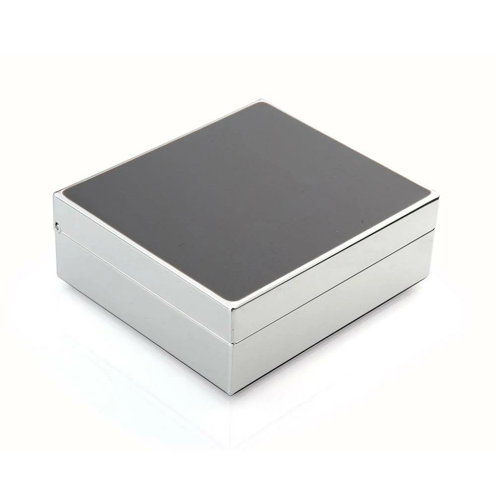 Beautifully finished this Taupe Enamel hinged box is finished with silver plate and lined with dove grey velvet. A perfect size for jewellery, cuff links or desk top bits and pieces.