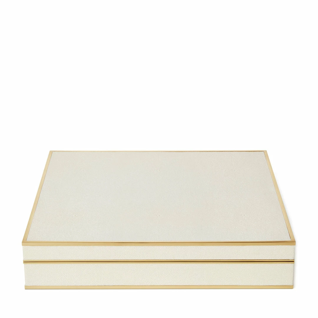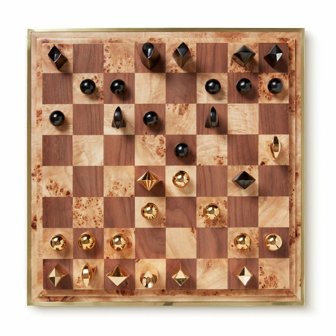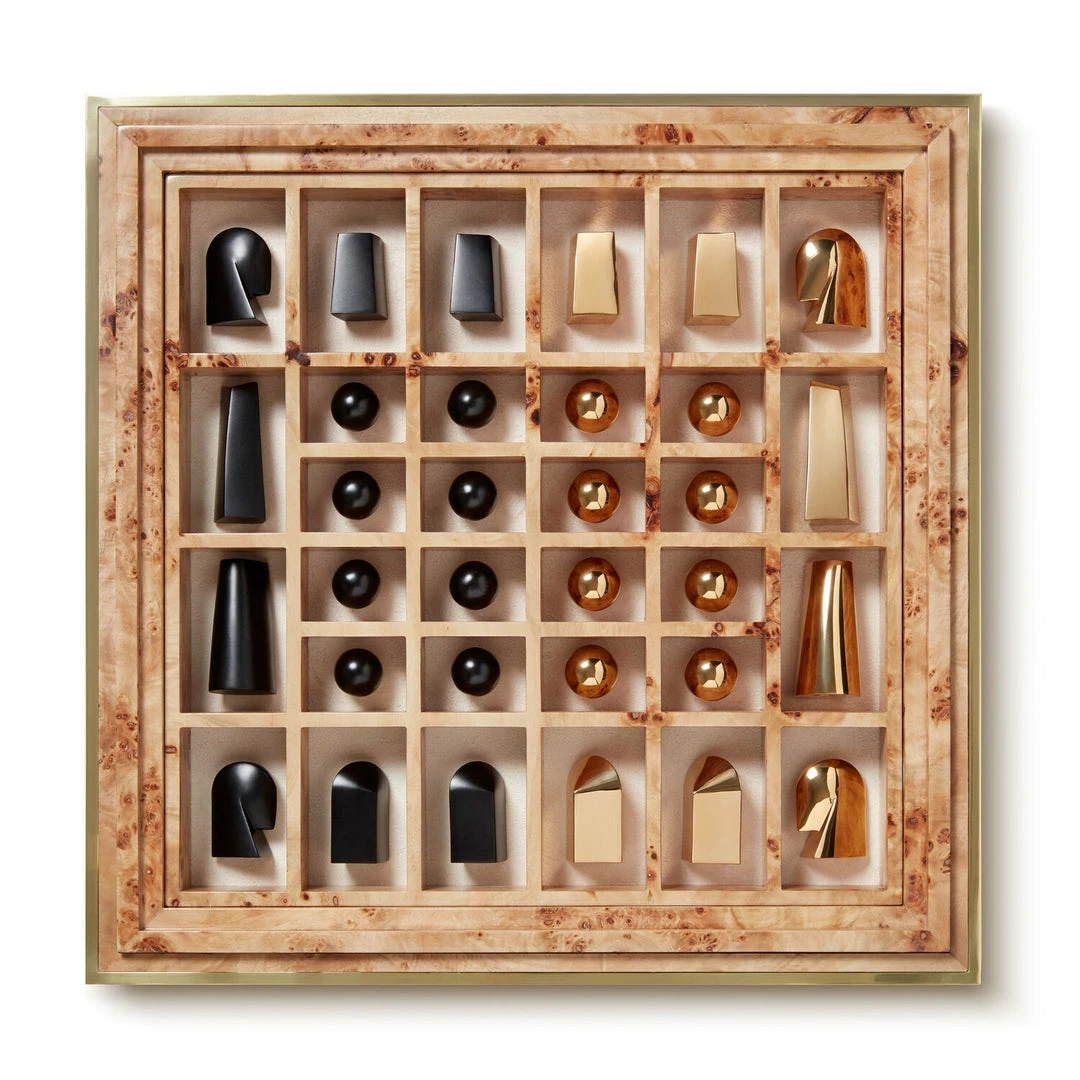 Beautifully presented in a luxurious shagreen box with brass detailing, this chess set has been given a contemporary twist with streamlined chess pieces cast in zinc, one in black and one with a gold-plated finish. Timeless and stylish, this is a game that will be passed through your family for generations.