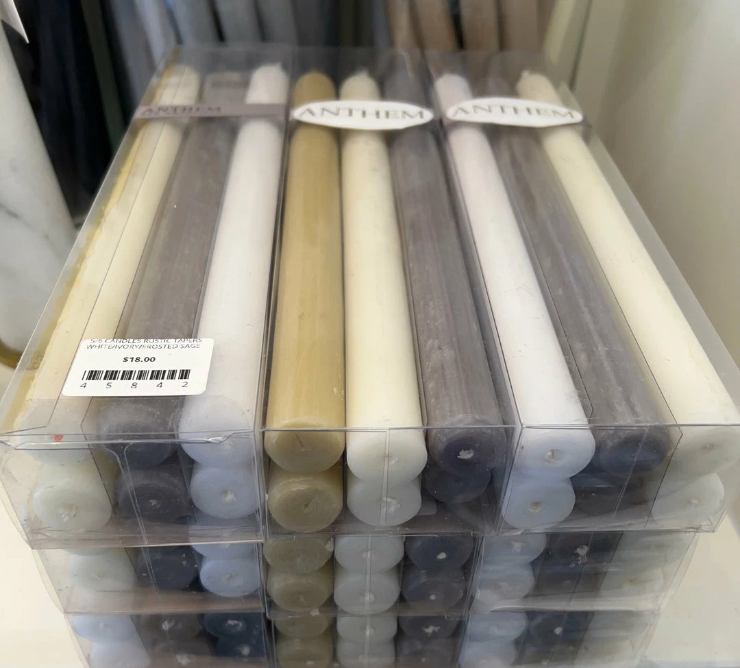 Our Rustic Tapers are made by horizontally pulling a very long 100% cotton wick through a tub of food quality paraffin over 100 times, then cutting it up into 12-inch pieces, and finally shaping both ends.