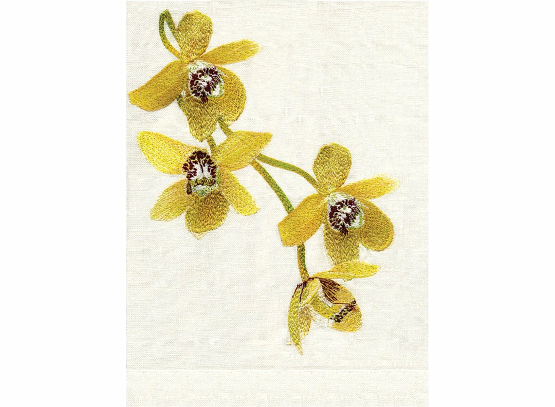 A super way to welcome your guests and dress up a powder room. Orchid flowers are embroidered on 100% Roma terry guest towels.
