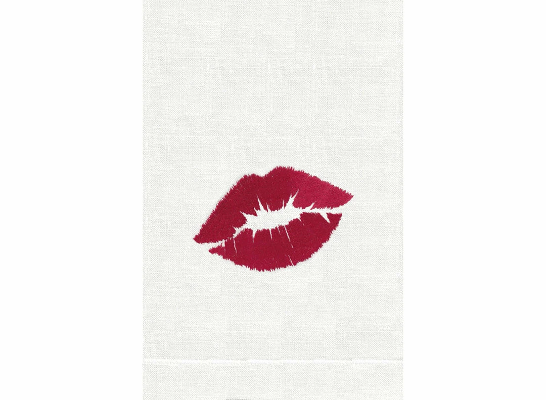 A super way to welcome your guests and dress up a powder room. Kiss is embroidered on 100% Roma terry guest towels and linen guest towels.