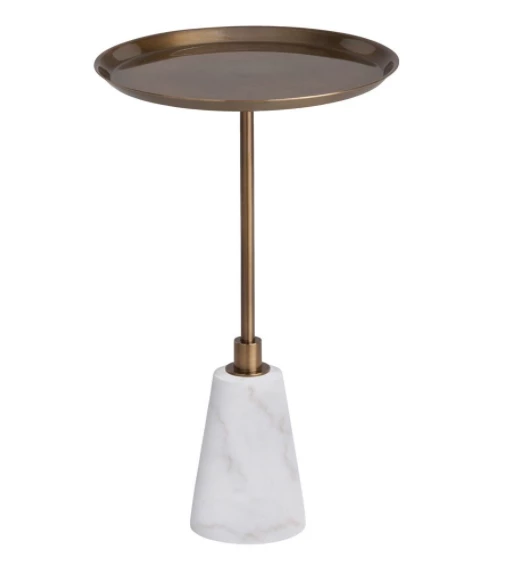 Make an accent to your home with this stylish White Accent Table. A perfect mix of white marble and antique brass. The height adjusts, still having a small footprint. The adjustable height (19″ or 21″) makes it possible to nest two of them together. The best-selling design.Â