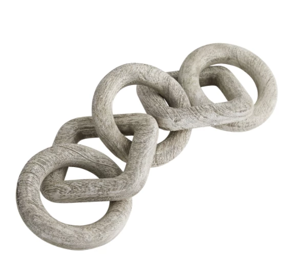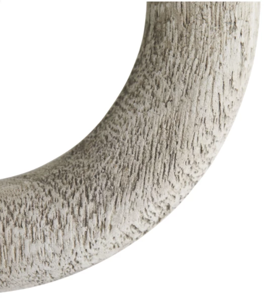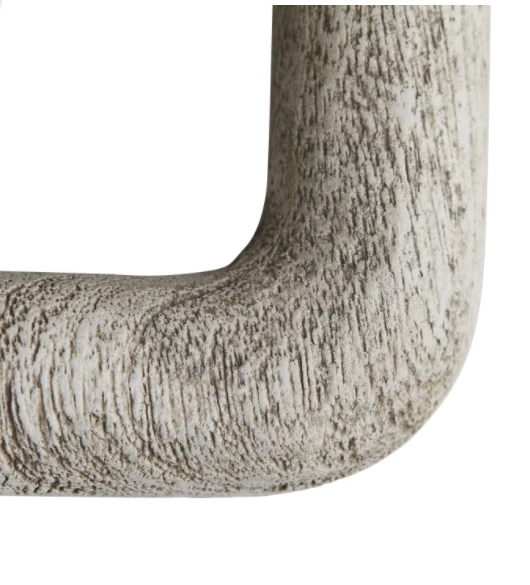 Crafted by hand simple geometrics intermingle with fashion to form this unique interlocking wood sculpture. A smoke finish accentuates the natural wood grain establishing a rustic quality that parallels with its modern form. A visual work of art for an entryway console or an étagère in traditional and modern settings. Finish will vary.