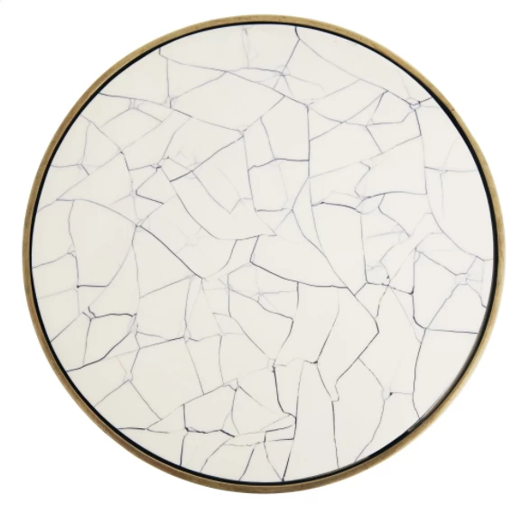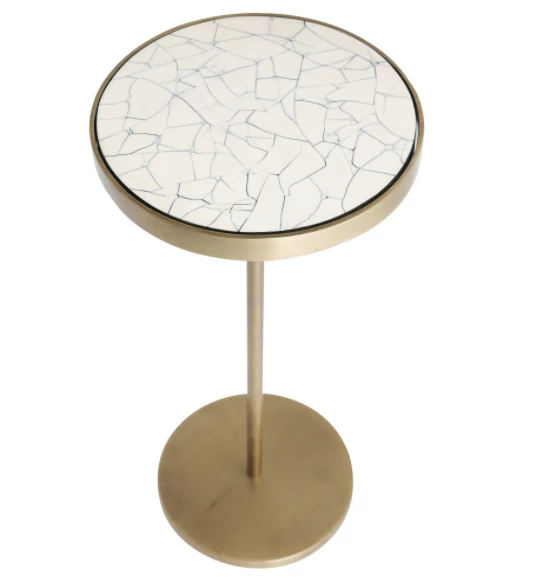 A lot of look for a petite table. The Leela boasts a crackled beige resin top in a organic triangle shape surrounded by an antique brass edge and base. The fractal design is highlighted with a touch of deep indigo, giving an edge to its understated beauty. Pair with the leela large accent table for more impact. Crackled finish will vary.