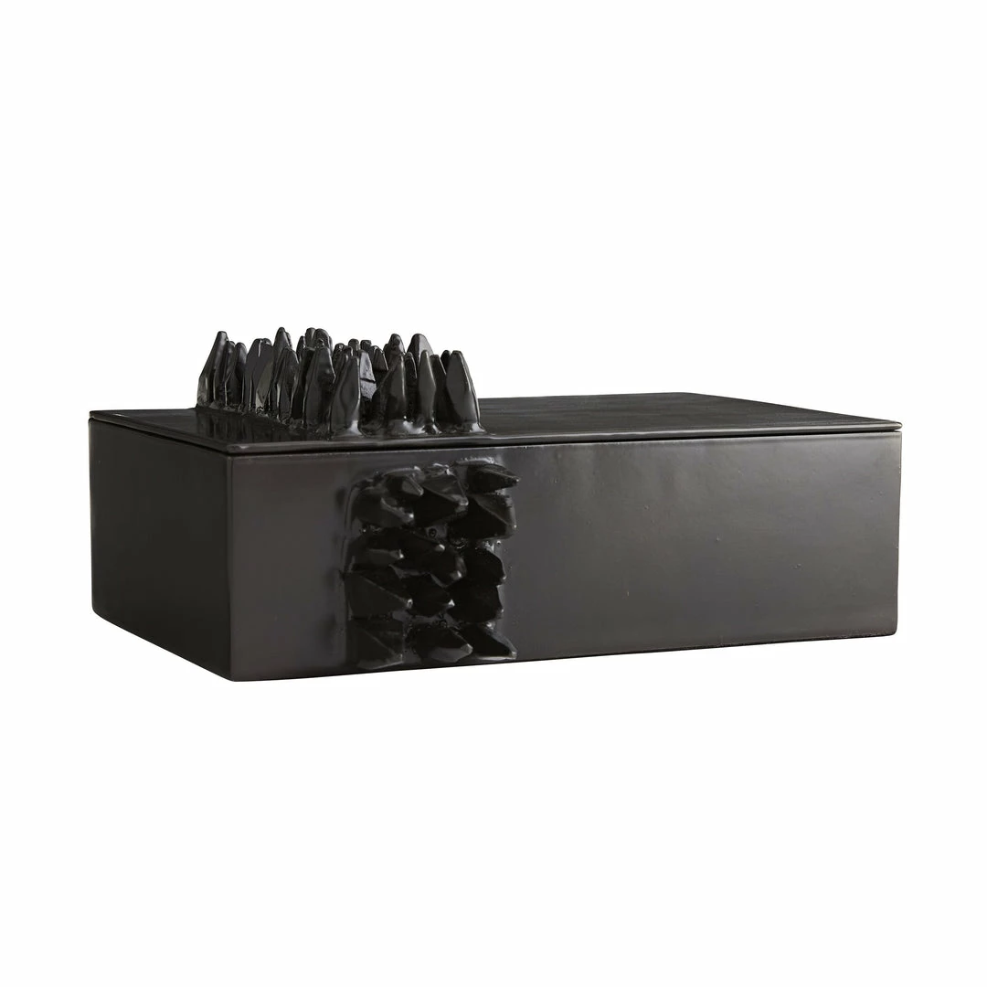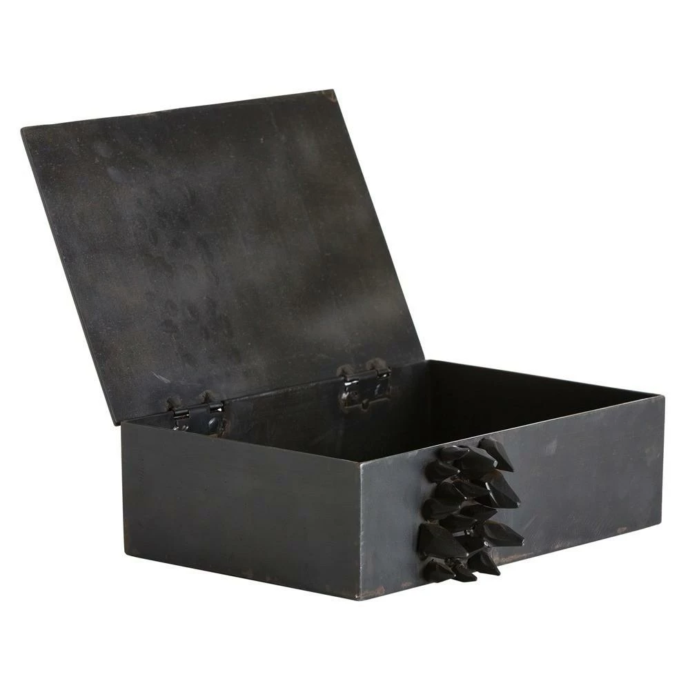This natural iron box with hinged lid has a band of faceted iron shards running across the sides and top. It is the perfect size for letterhead or important documents, or you can even use it to store your watches. The bottom is lined in black microsuede to protect your treasures.Â