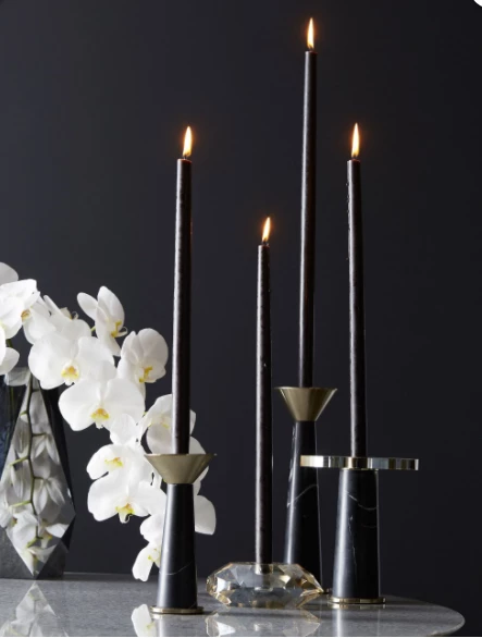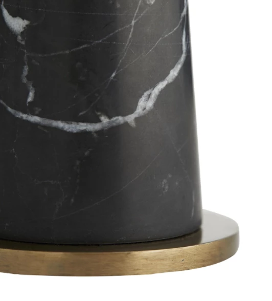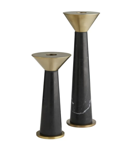 Create a tranquil setting while delivering a luxe touch to a room with these delicate candleholders. Each features a conical-shaped antique brass that funnels into a white marble base fitted with an antoque brass foot. The glow of a taper candle’s flame creates ambiance and simultaneously accentuates the fluidity of the veining on the white marble base. The varied heights work to add depth and dimension to a console top or an etagere shelf. Marble may vary.