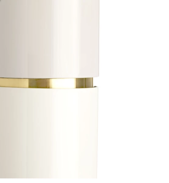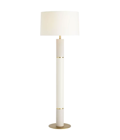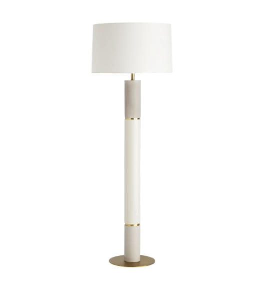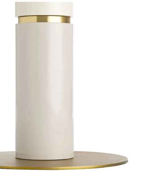 Luxe lighting defined. The Hope’s simple columnar profile presents a two-toned lacquer finish of cream and dove, which is met with antique brass inlay breaks for an extra layer of lustrous style. A contemporary complement for modern spaces. Topped with an off-white cotton drum shade with off-white cotton lining and an antique brass sphere finial.