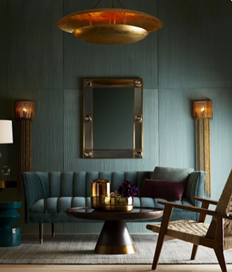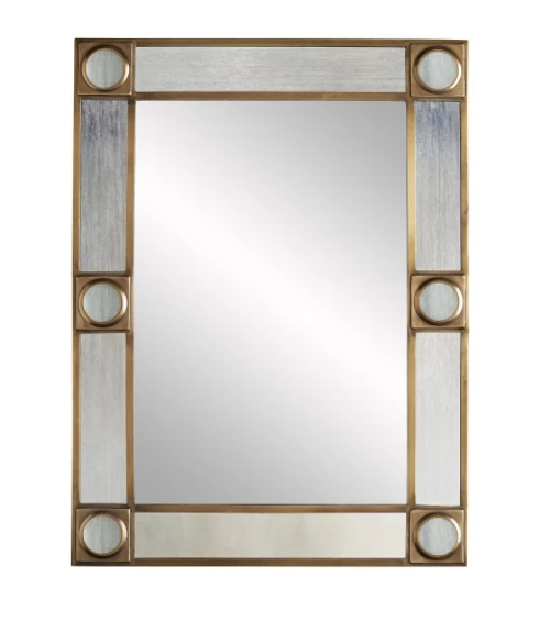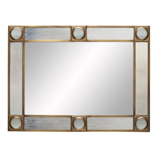 A chic steel blue colored mirror frame accented with magnifying glass rounds set in antique brass. The mirror is both perfect for hall or big room. Can be hung vertically or horizontally.Â