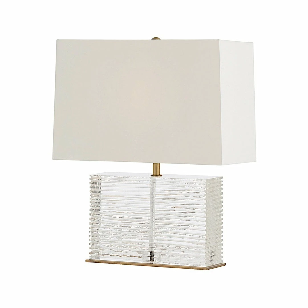 With a body made of clear crystal, this lamp draws inspiration from the works of renowned transparent designers Charles Hollis Jones and Joseph Eichler. The lamp’s transparency is accented by its etched ridges and antique brass neck and base.Topped with a rectangular, ivory microfiber shade that is lined in the same.