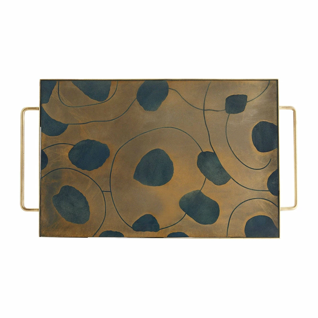 Serve hors d’oeuvres at a soiree or store prized pieces on a vanity with the emilia, black and mercury flora cell-like spots span across the antiqued glass surface creating a vivid visual. Antique brass iron handles and four round feet make this piece functional. Finish will vary.