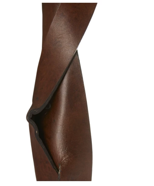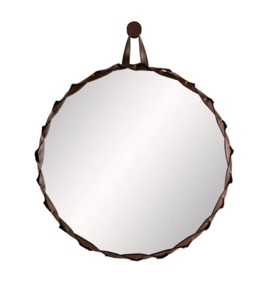 This mirror has a simple but stylish design. Bands of tobacco-hued leather surround the plain glass mirror and is topped with a brass-plated knob and matching leather loop, so it has an almost equestrian feel. The knob is purely decorative, though, because the base is mounted with a security cleat.Â