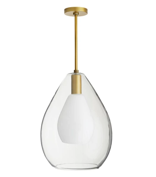 Two shades of hand-blown glass forms the drop of this pendant. Seemingly simple in its design, an inner teardrop-shaped shade conceals a standard bulb in opal glass, then a larger shade rests outside it, exposing the inner piece in clear glass. Both hang from a stainless steel stem and mount, both finished in antique brass. Damp-rated, although limited covered outdoor conditions may affect finish.
