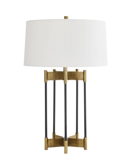 The Lockport lamp’s architectural design is given an artisanal touch. Contrasting English bronze framework and antique brass iron crossbeams are artfully stacked for an intentional structural transition. A chattered detail accents the top and bottom crossbars, adding a texture that is highlighted when illuminated. Topped with a white linen shade with white cotton lining and an antique brass cylinder finial. Finish will vary.