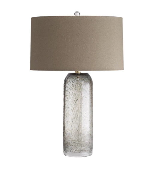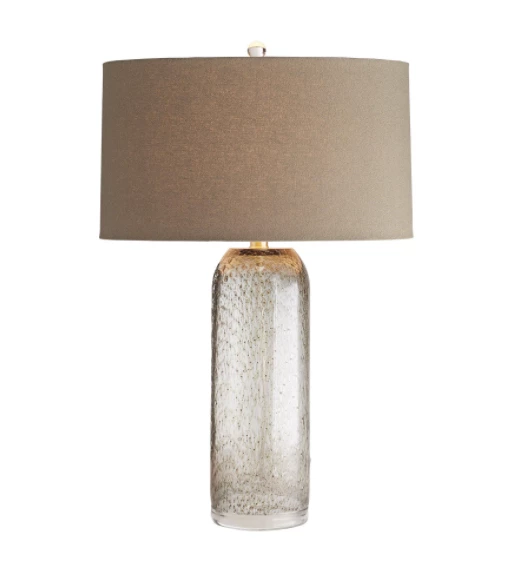 Mystery and allure inundate this vase in its smoky tones and sultry design. Heavily seeded glass is hand-blown by glass artisans, meticulously crafted to get the richly seeded textures you see here. The base features a thickly weighted bottom and is topped with antique brass finish accents. Fitted with an oval barrel shade in sepia linen and ivory cotton lining with an acrylic ball finial. Seeded glass textures may vary.