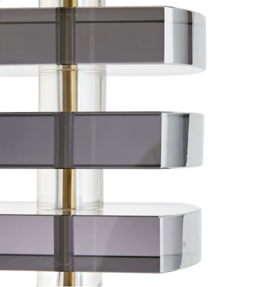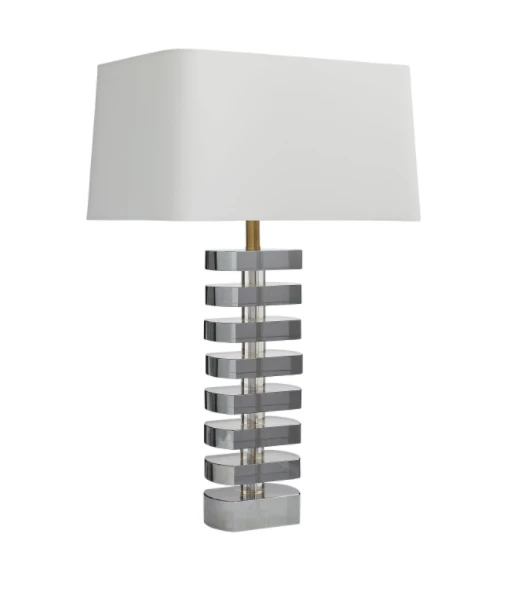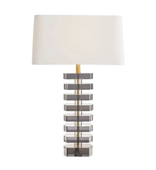 The Smoke Crystal Lamp has a stylish combination of smoked and champagne colored crystal. The clear finish creates reflections and shadow play. The clean theme is continued throughout with the rectangular, cloud gray microfiber shade which is lined in a white microfiber.