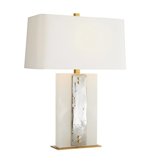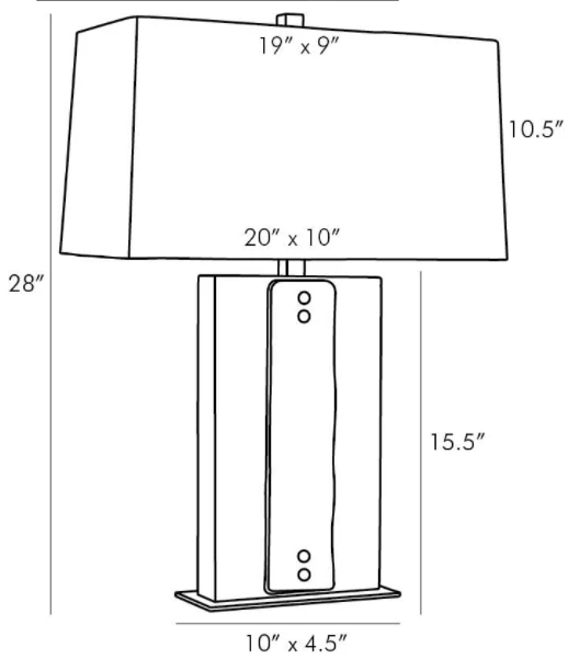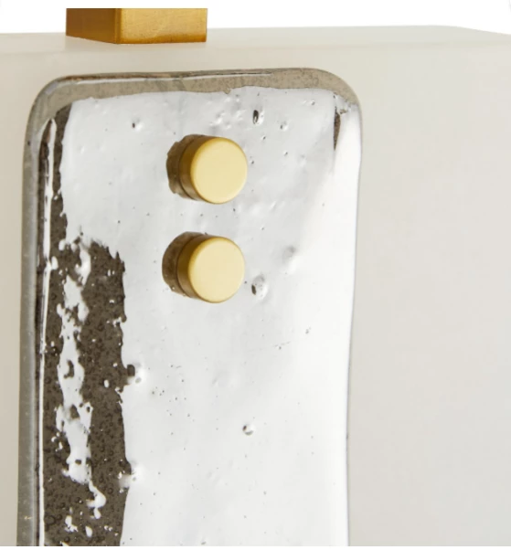 Let the Uriah lamp elevate your table top to museum status. A thick, seedy slumped glass in a smoke luster finish cascades down the front of a snow marble wall to create this functional showpiece. The use of mixed materials that shape this rectangular form brings a refined organic element to a space. Topped with a rectangle off-white microfiber shade with off-white cotton lining and a matching metal finial. Finish will vary.