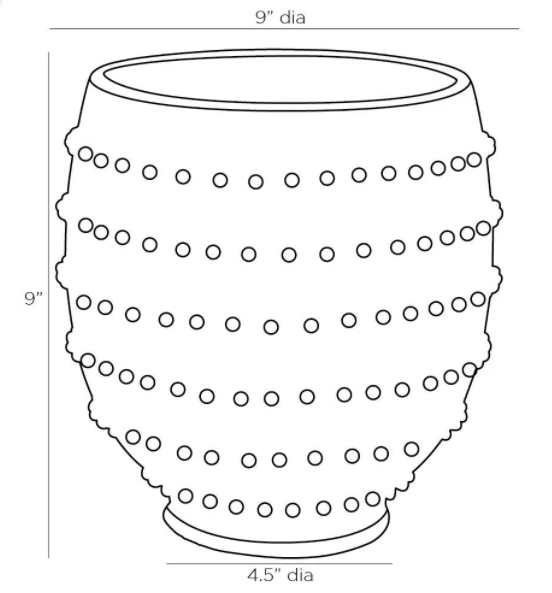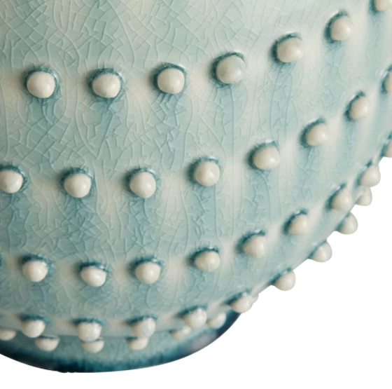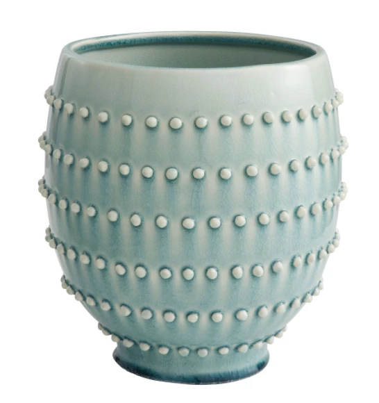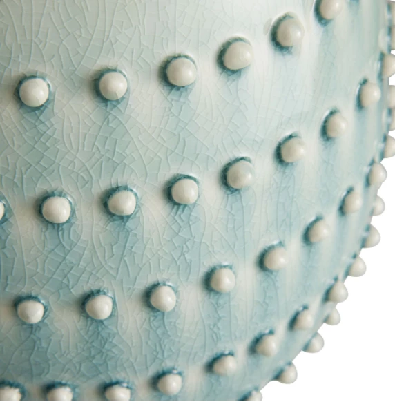 A ceramic vase in a celedon finish, dotted with soft, hand-applied beads for a unique design. Pair with its larger version for an awe-inspiring look. Finish will vary.