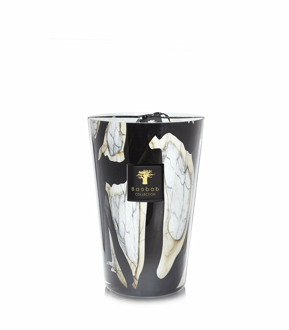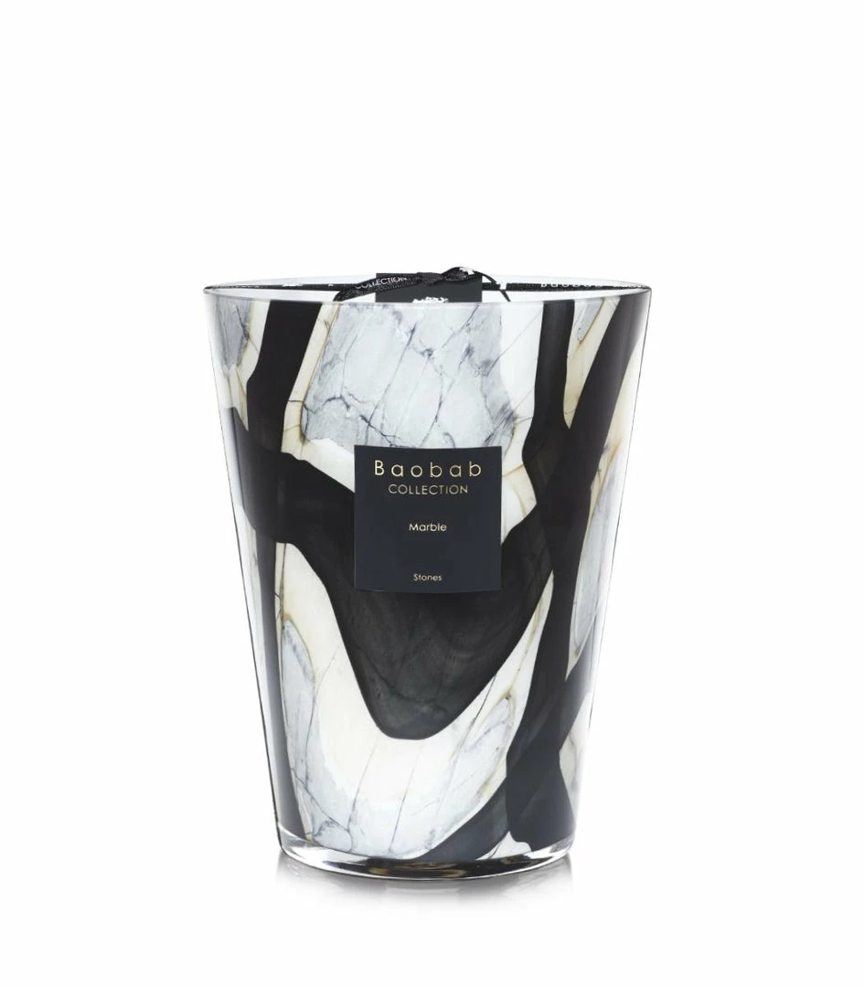 The scented candle is set in a hand blown glass replicating grey marble with black strokes edged with beige.