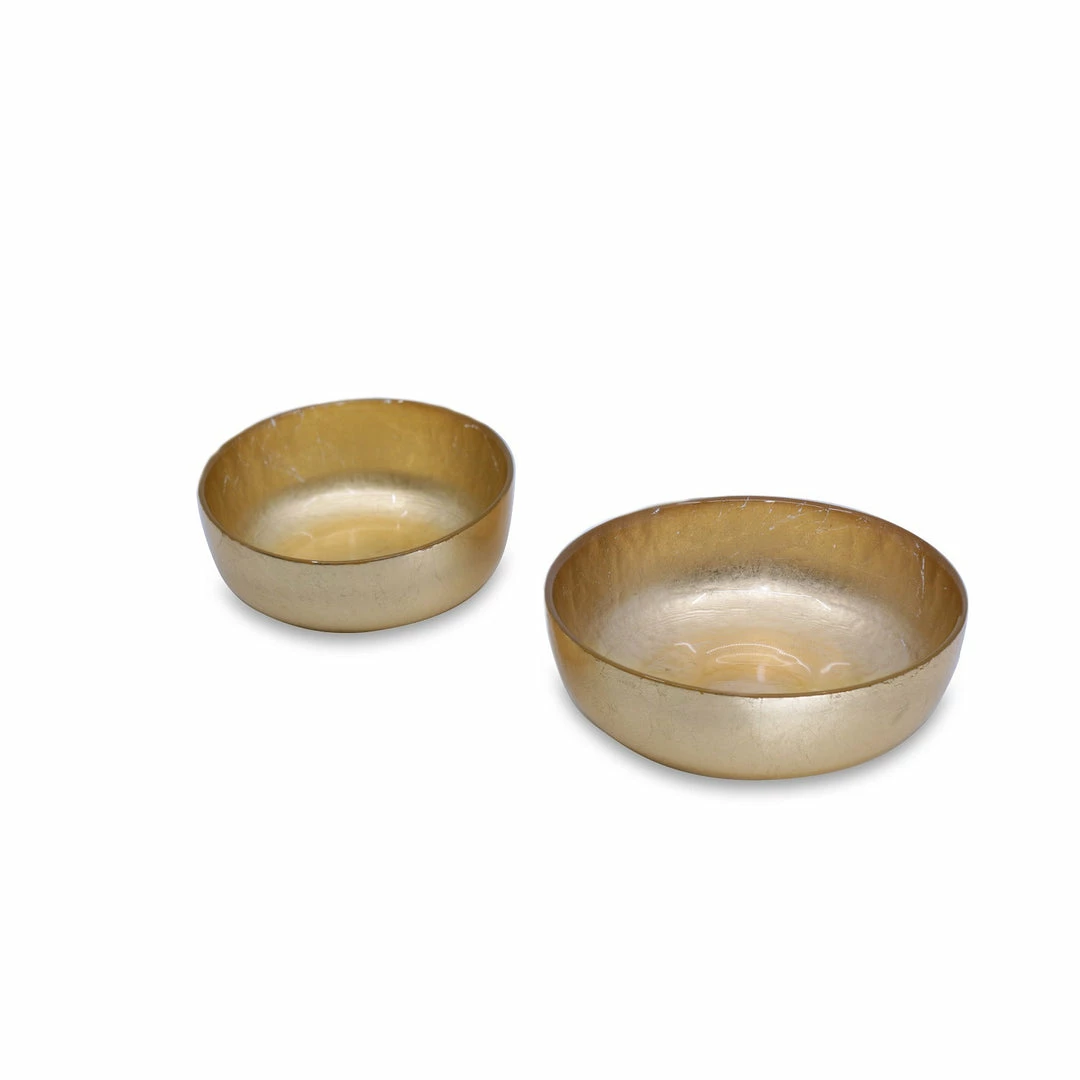 The New Orleans Glass Shallow Round Bowl is a glass bowls with hand applied gold foil in two useful sizes. ldeal for serving snacks and as home décor.