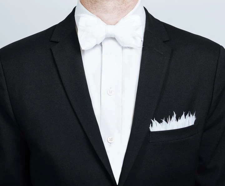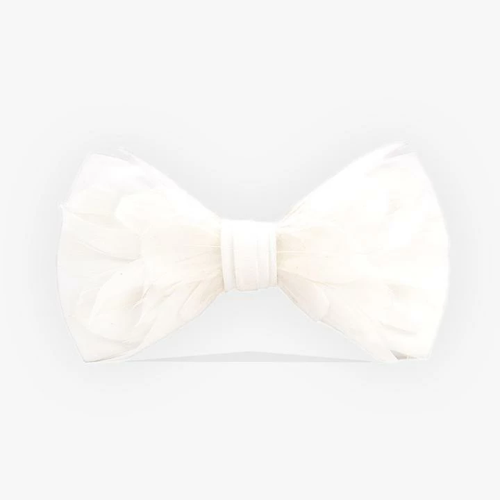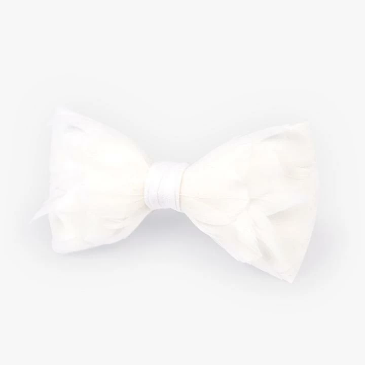 The Carew bow tie is made with all white goose feathers. A special technique gives this tie a slightly ruffled look, adding interest, depth and dimension.