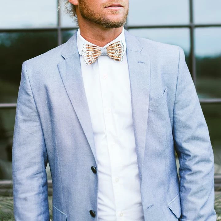 - Feathers for bow ties are hand-selected, giving each finished piece unique coloring.