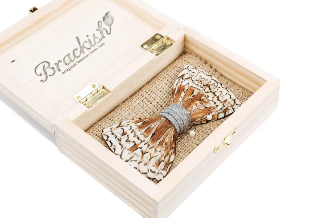 The Grey Bobwhite is a quail feather bow tie that highlights the contrast of light brown with black and white specks. Center wrap is a grey linen-like material.