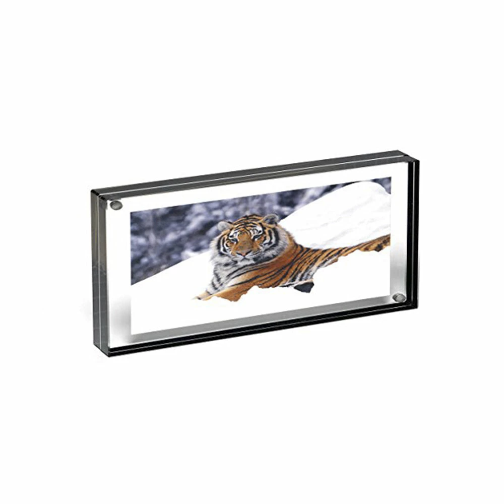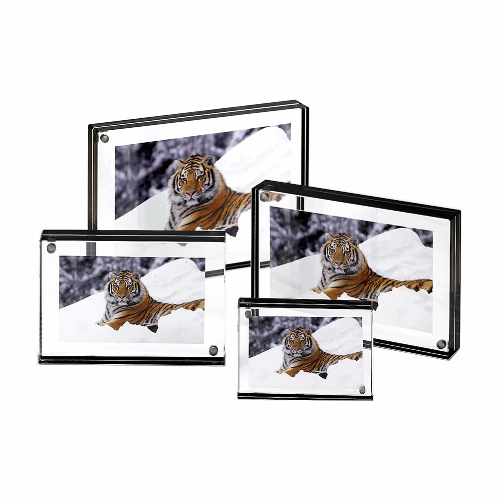 The Graphite Edge Magnet Frame has an accent of sheer black on the edges of the frame. Made of two thick panels of crystal clear, solid acrylic held together by tiny magnet points, the picture is easily placed between the two panels and held securely without any hardware. Display 2 photos back to back, horizontally or vertically.
