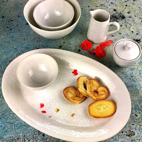 Cozina serving pieces have that “fit anywhere” look to complement any decor. This oval platter can be the focal point in the kitchen, on the table or in the living room. Our custom white, softly sponged glaze gives it a casual but elegant look. Easily mixed and matched with other patterns. 16″ long x 11″ wide.