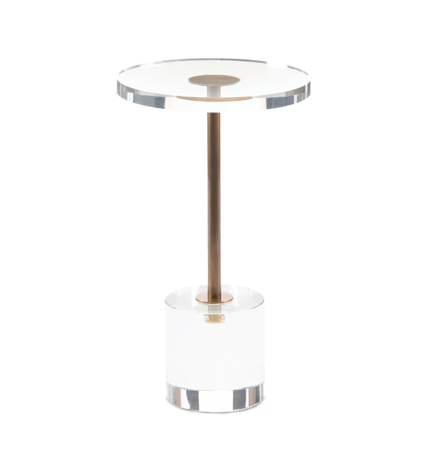 A brass and acrylic pedestal martini side table.