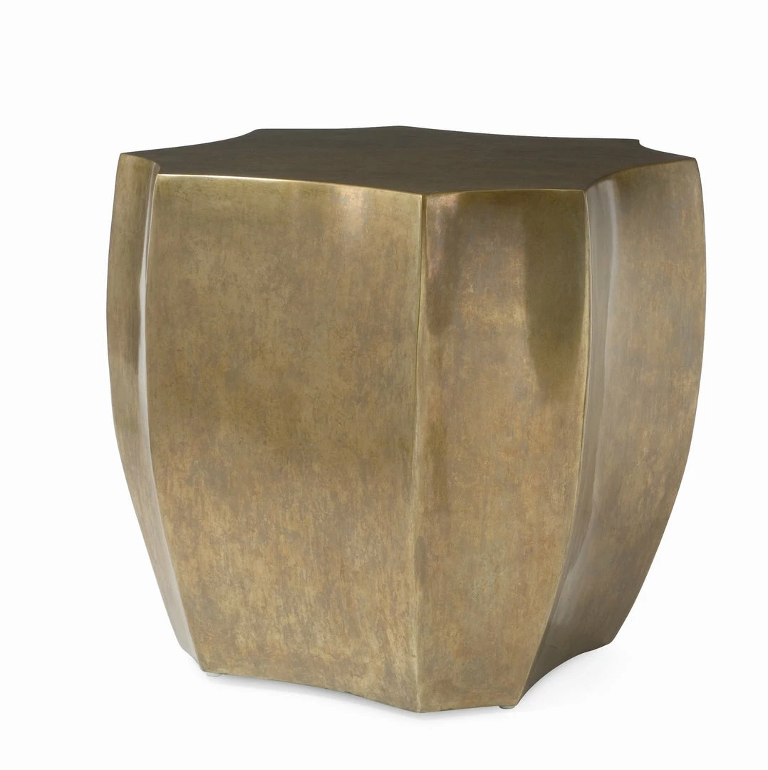 The Emerge Brass Lamp Table is a sculptured eight sided form that starts small at the floor and grows to its full size at the top. The table itself is made from cast stone which makes it substantial then it is electroformed with brass and finished in stunning antique brass.