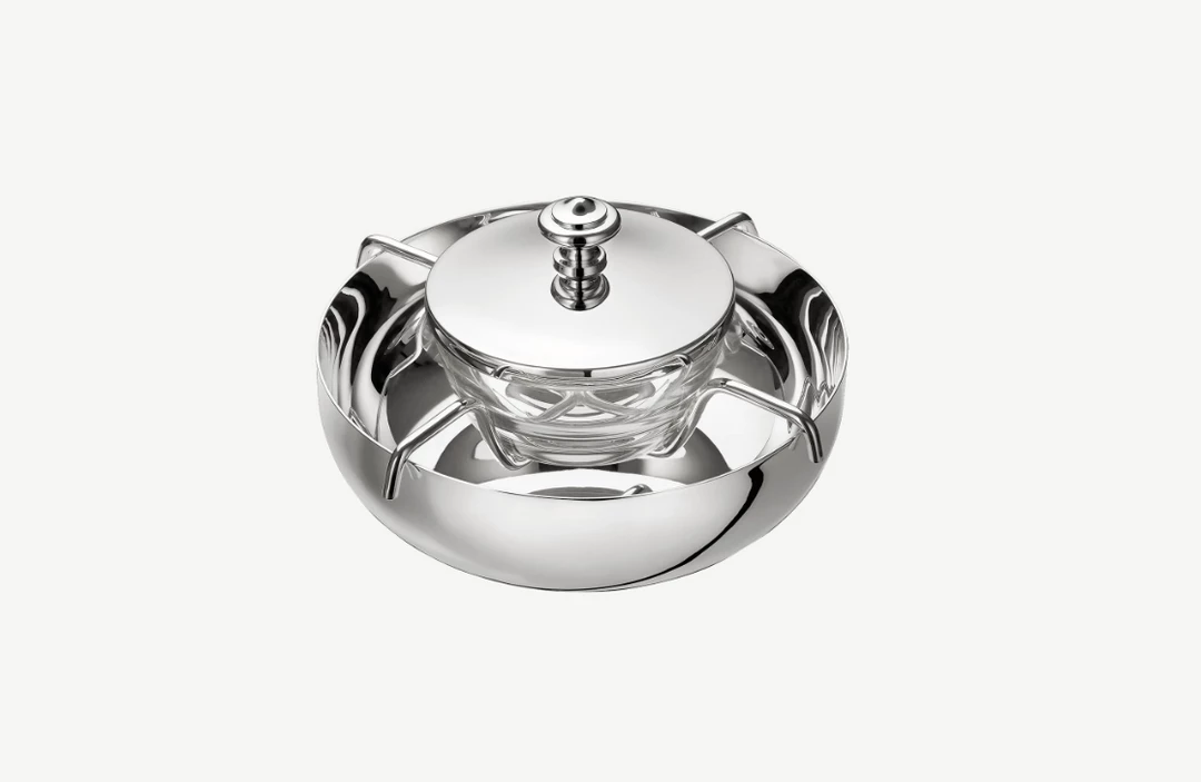 A two-piece silver plated caviar serving set in the Albi pattern contains an outer presentation for ice and a lidded bowl that can hold 4.4 oz.of caviar. The Albi line, created in 1968, takes its inspiration from a French town located between Toulouse and Bordeaux and its famous cathedral known for its remarkable architecture, clean straight lines and single nave.