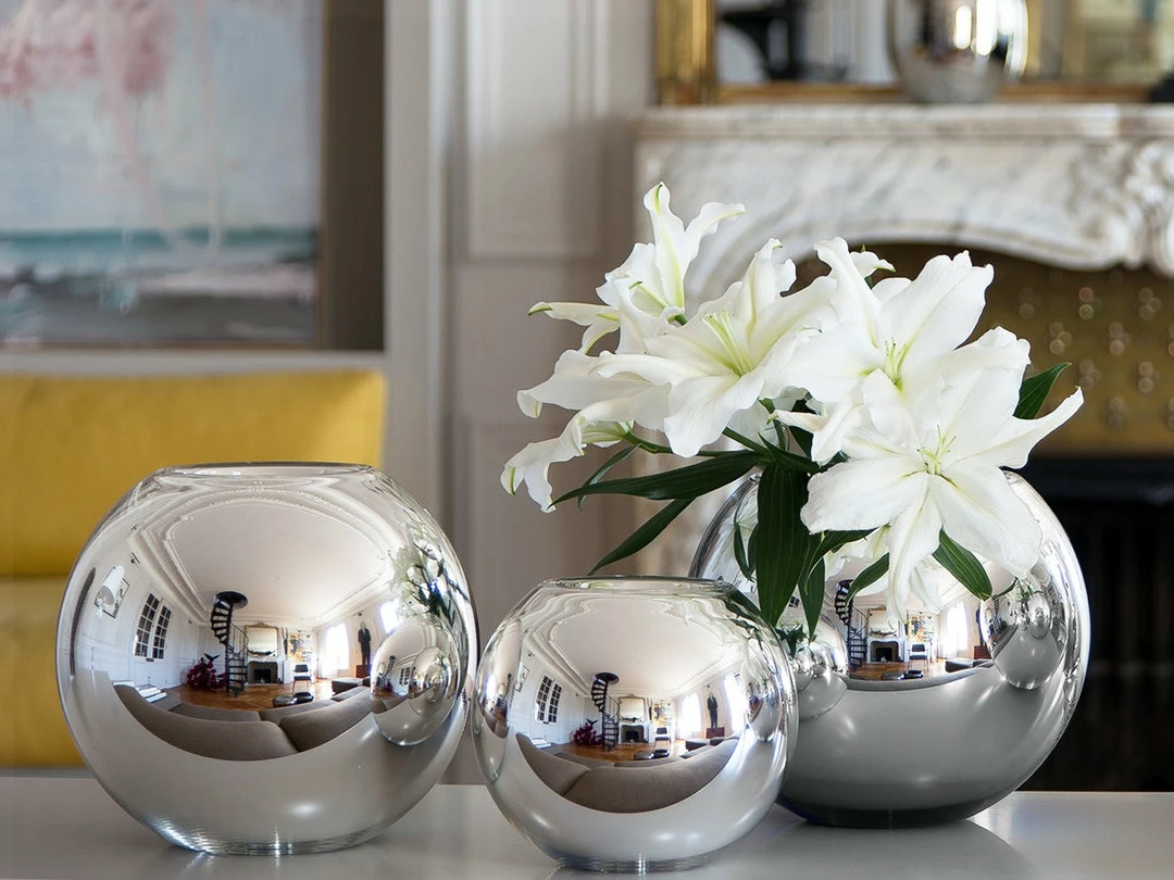 Our rounded Uni Vase is made with double sided metallized glass with silver. Each piece is handmade and manufactured in a small workshop of mouth-blown glass. With their contemporary shape, each Uni vase brings elegance and sophistication to any room in your home.