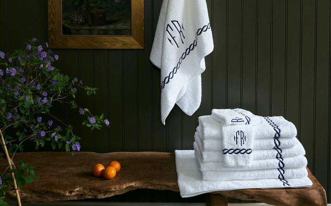 Our Classic Chain features a flowing motif inspired by ancient Greek treasures, neatly embroidered on Ciaro long-staple cotton terry. It’s soft colors and subtle movement create a timeless, understated beauty.