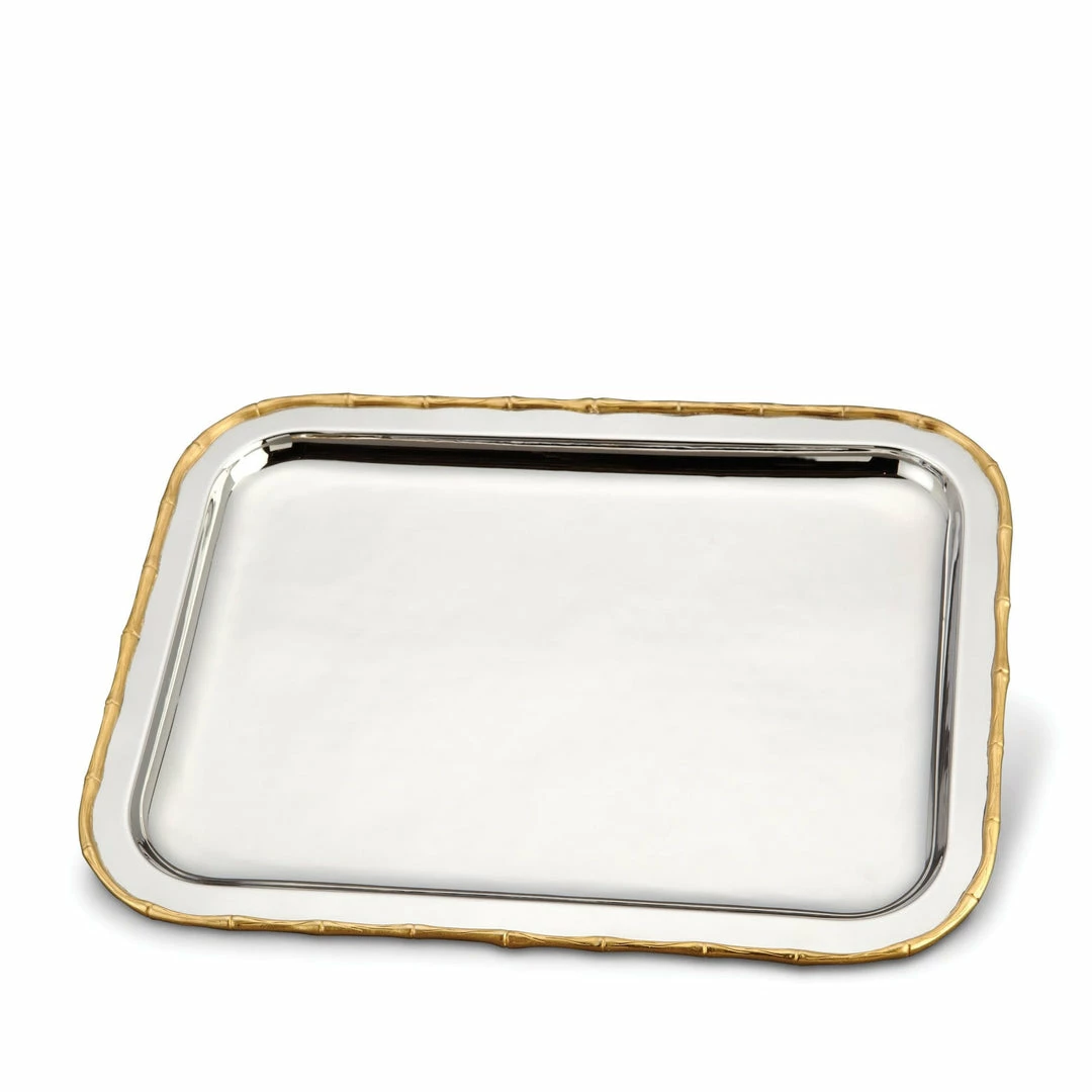 Set against the seemingly liquid surfaces of stainless steel and nickel-plated brass, the delicate 24K gold-plated bamboo border is applied by hand to create serveware with unique beauty.