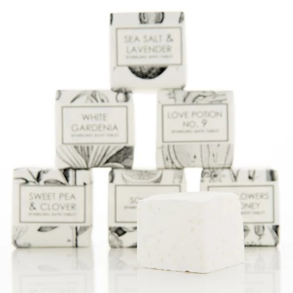 Our sparkling bath tablets (otherwise known as fizzing bath bombs) are made of ground dead sea salts mixed with our signature scent blends. When placed in a full tub of water, the tablet fizzes and dissolves in the water making for a relaxing and soothing bath. This type of bath soak is much better for your skin than a bubble bath (which can be drying and irritating as they contain foaming agents) but just as indulgent. We recommend one cube per bath, although they can be broken up. Â