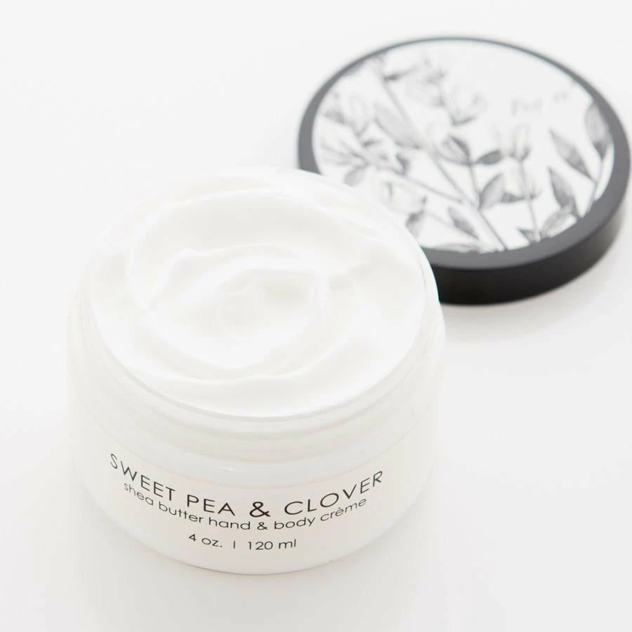 Sweet Pea & Clover is a fresh green & springy scent. This light weight hand creme contains 5% shea butter. It’s perfect for anyone who wants a rich moisturizer without a heavy greasy feel. Healing aloe and vitamin E help restore softness and elasticity. The essential oils in this hand creme are blended in unique scents ranging from subtle to invigorating.