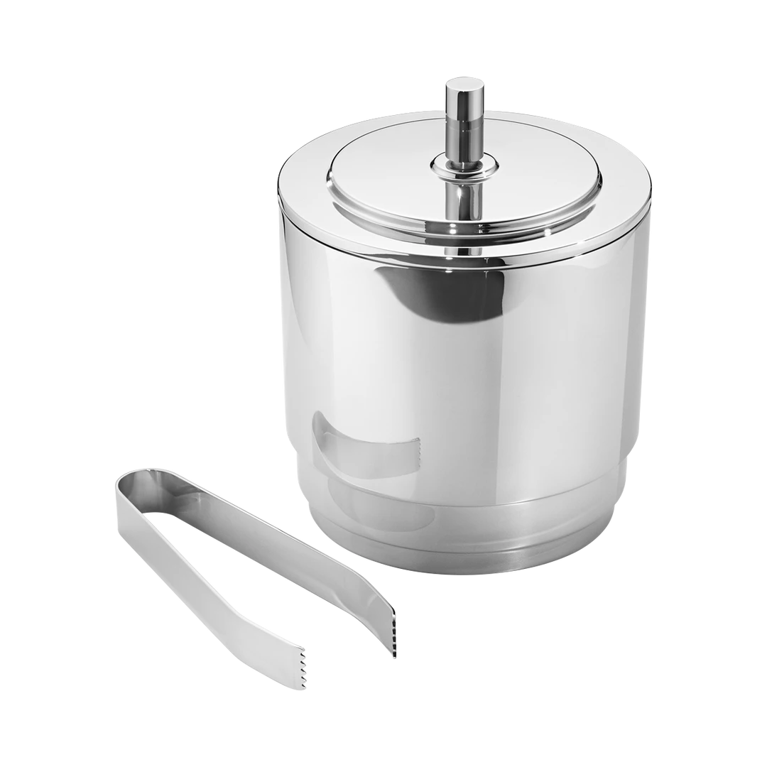 The ice bucket, with its tightly fitting lid, and the tongs are all made from stainless steel, polished to a mirror finish that reflects the light beautifully.