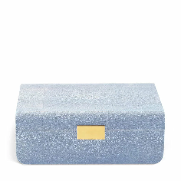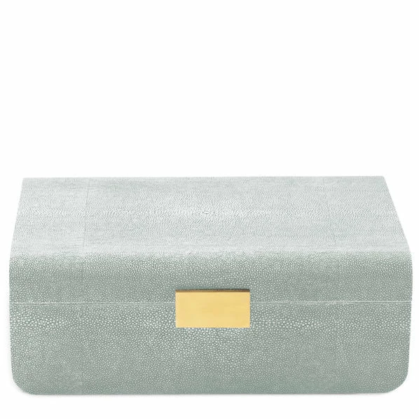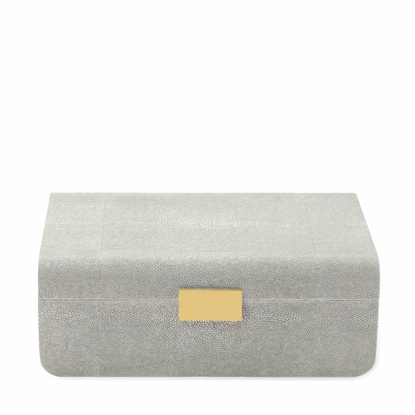 This decorative box is finished with a textured, embossed shagreen. Its curved lines have a sculptural appeal, while brass detailing adds a stylish touch. Use it for jewelry on a vanity or to organize personal objects on a desk or table.