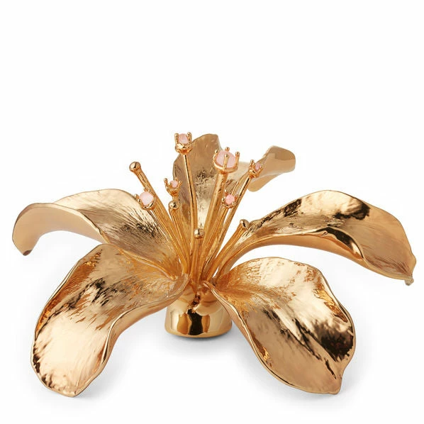 A delicate, hand-sculpted flower in brass that has been further embellished at its center with semi-precious stones. This objet makes a perfect gift for a loved one and is a beautiful addition to a vanity.