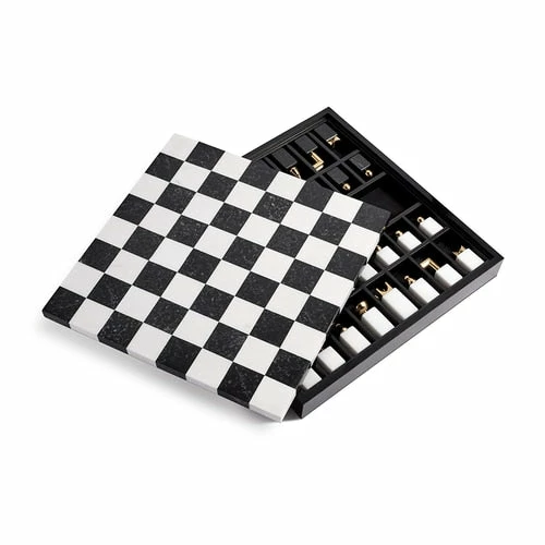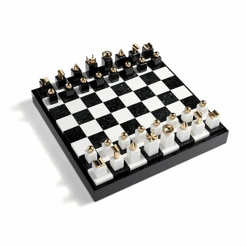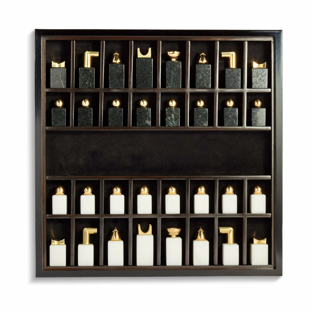 A thoughtful combination of fine textures and finishes with materials such as lacquered Macassar ebony wood, marble, brass and shell inlay, this handsome piece will become the focal point of the room. Marble and brass chess pieces are abstract interpretations of the iconic movable objects.