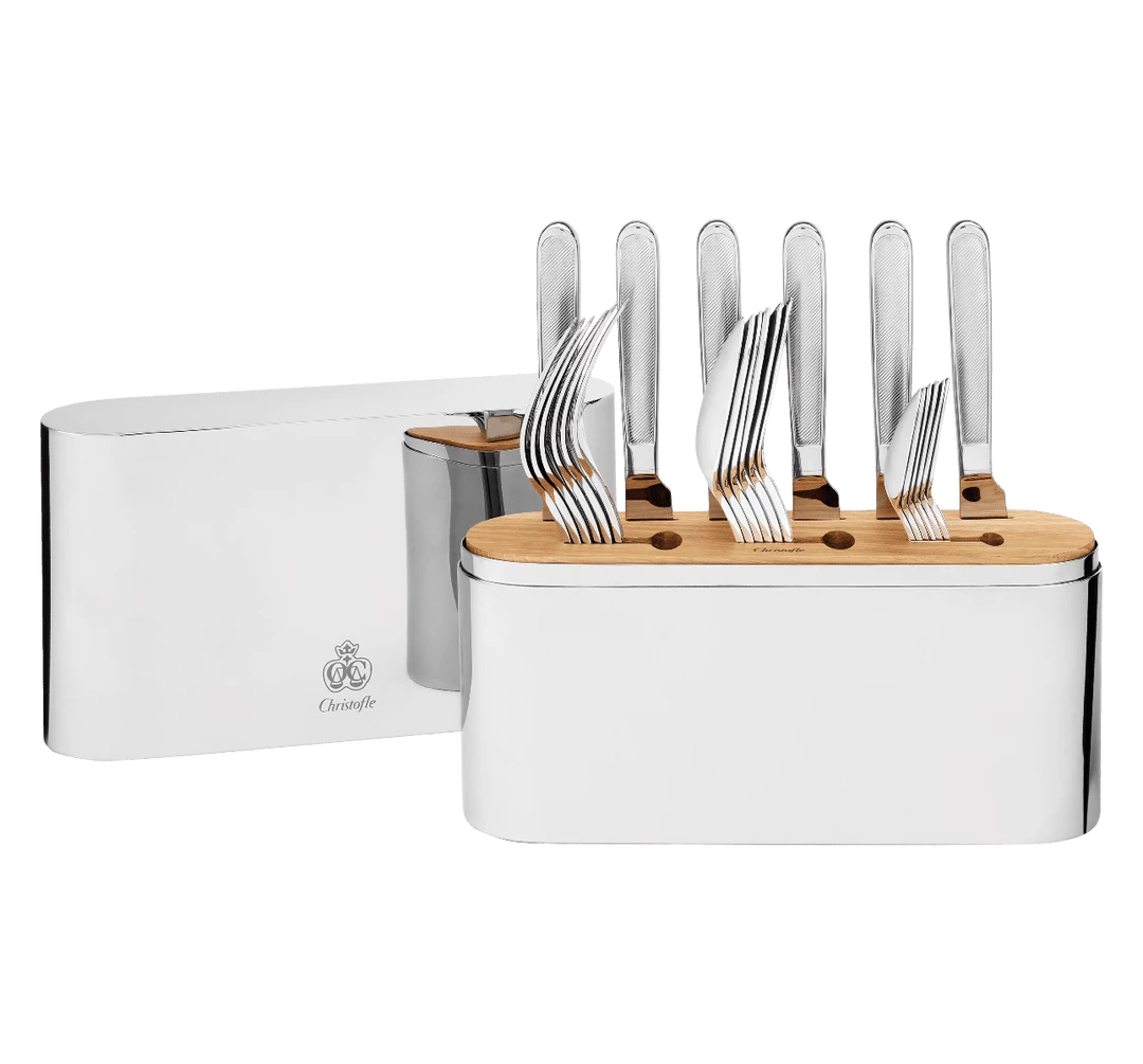 This 24-piece stainless steel 24-piece set contains dining essentials for 6 people including 6 table forks, 6 dinner knives, 6 table spoons, and 6 coffee spoons. A mirror polished stainless steel case with a white oak wood interior disk stores the cutlery.