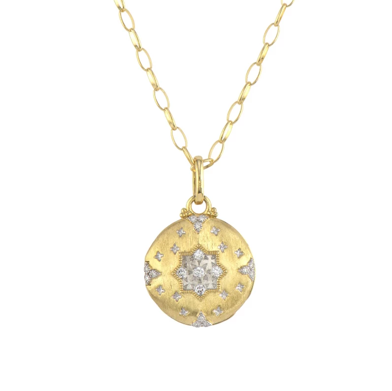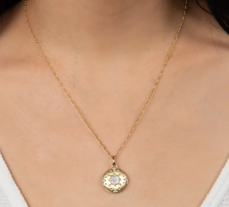 From the Moroccan Collection, the star center circle necklace features a gold and diamond pattern with a celestial circle pattern with 18K yellow gold.