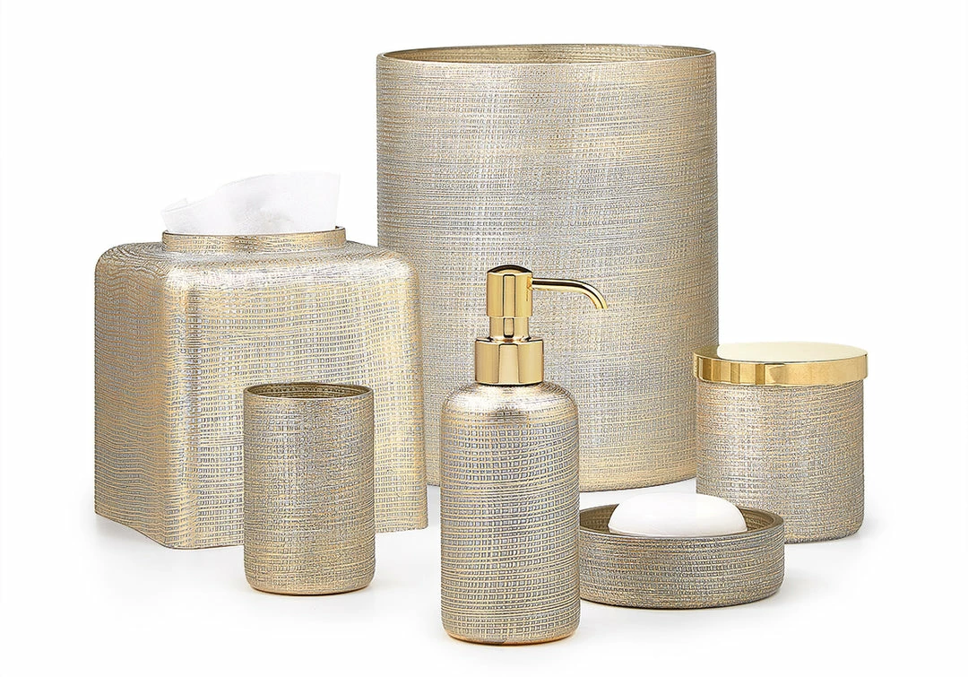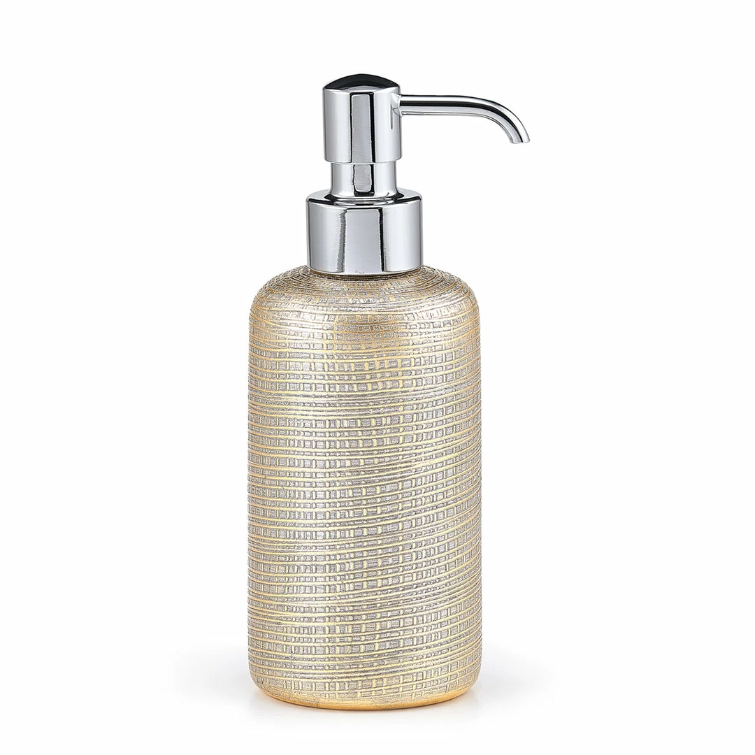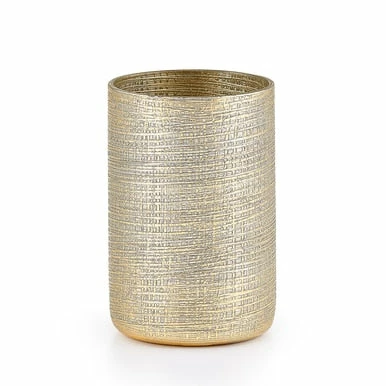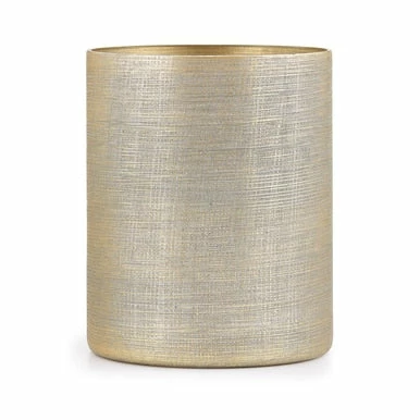 Gold and silver mingle together in this beautifully textured glass collection. The glass is mouth-blown and decorated by hand. The distinctive “woven” look is created as layers of rich metallic enamel are fired onto each piece. Made in Italy.