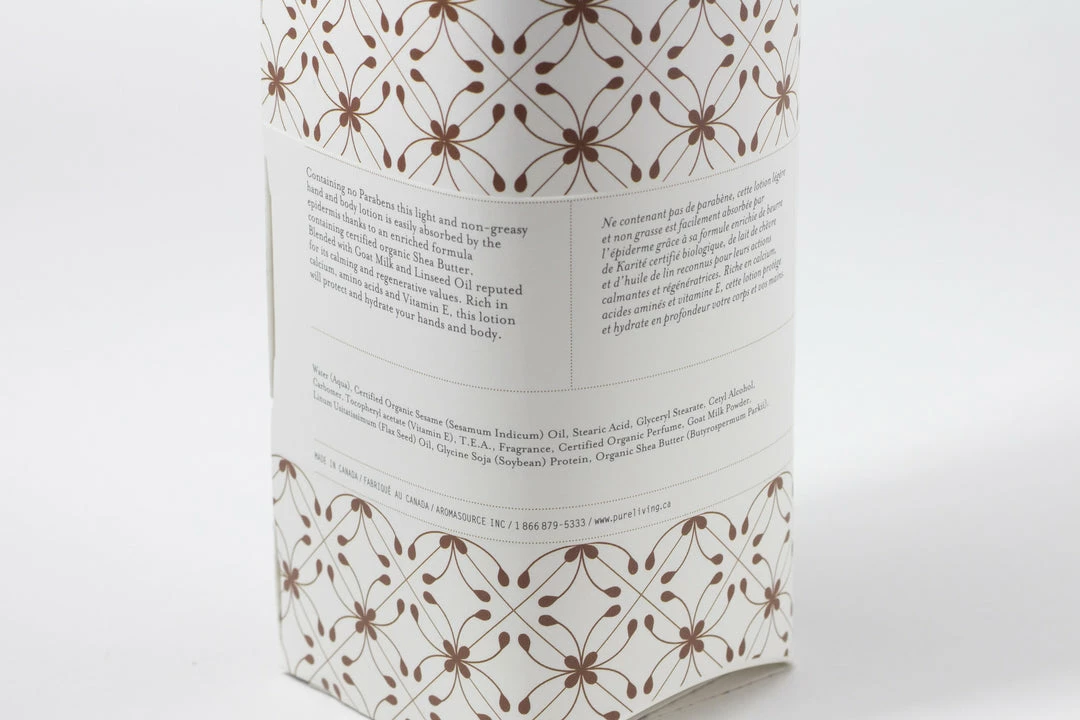 Containing no Parabens this light and non-greasy hand and body lotion is easily absorbed by the epidermis thanks to an enriched formula containing certified organic Shea Butter. Blended with Goat Milk and Linseed Oil reputed for its calming and regenerative values. Rich in calcium, amino acids and Vitamin E, this lotion will protect and hydrate your hands and body. Â