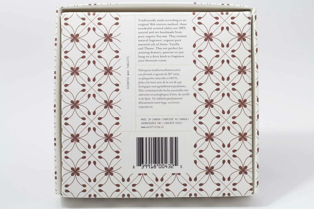 Traditionally made according to an original 16th century method, these wonderful scented tablets are 100% natural and are handmade from pure organic Soy wax. They contain natural fragrance, organic pure essential oils of Anise, Vanilla and Thyme. They are perfect for scenting drawers, pantries or just hang on a door knob to fragrance your favorite room.