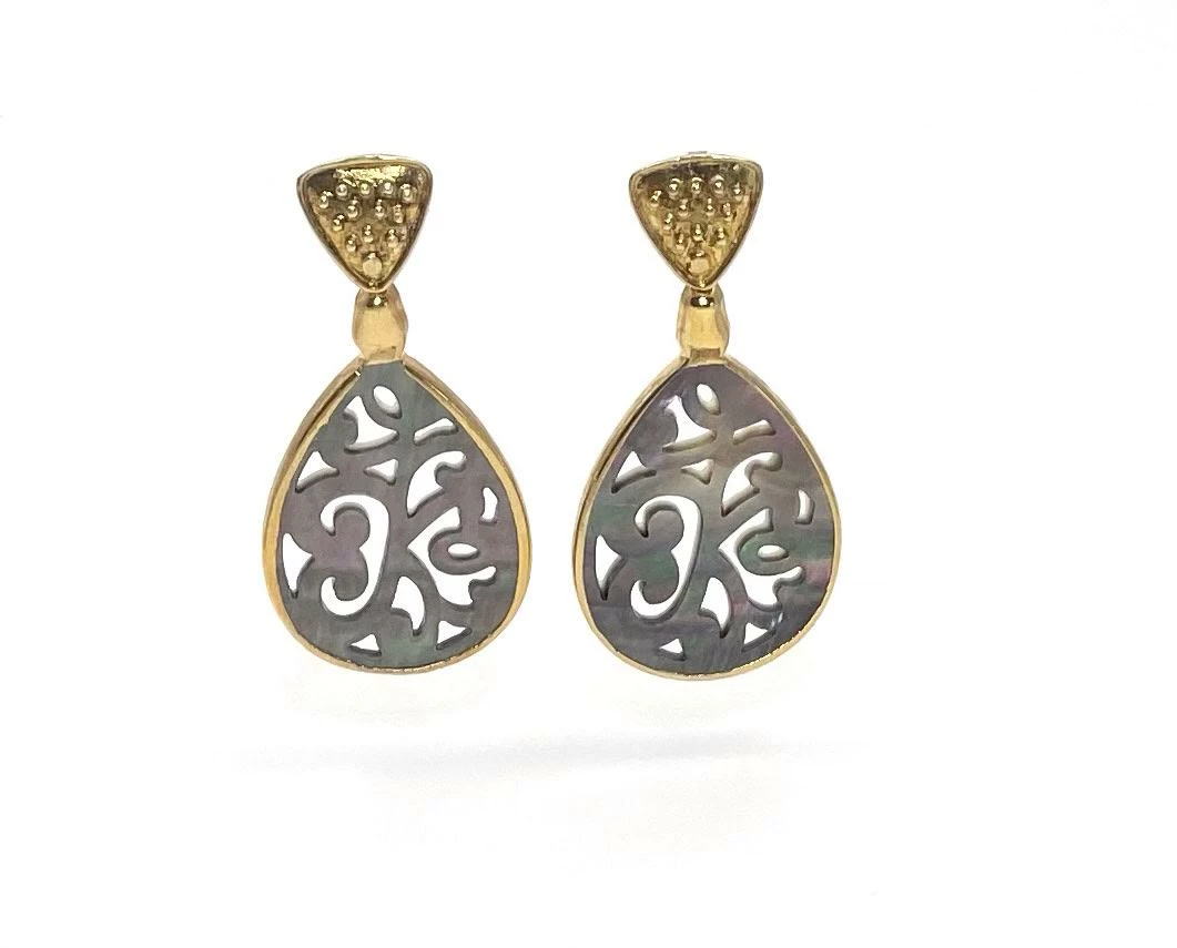 Luminescent grey Mother of Pearl drops set in 14k gold plate with 14k gold plate triangle posts. 2”